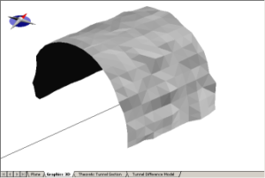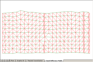 This view shows the tunnel difference models for the tunnel. The orientation mode is a plan view with a longitudinal section vertically and dimensions along the tunnel wall horizontally in the window.