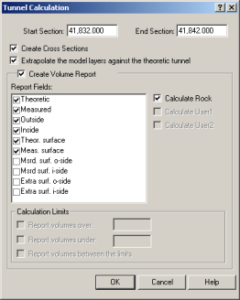 Volume calculation can be done against a theoretical tunnel with optional offset, and is limited in side and height. A volume report, together with the extensive drawing functions, provides a detailed account and control of the tunnel.