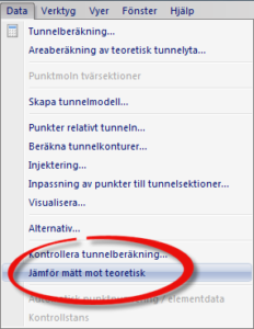Colored tunnel difference models can be created from the tunnel calculation, and a folded tunnel difference model in 2D can be created where intrusions and overburden are reported with user-defined color scales. The corresponding 3D difference model can also be created in the same function. These models are created in AutoCad’s DWG format. We call the function “Compare measured against theoretical” and you will find it under the data menu when a tunnel calculation (* .tbs) is open and active.