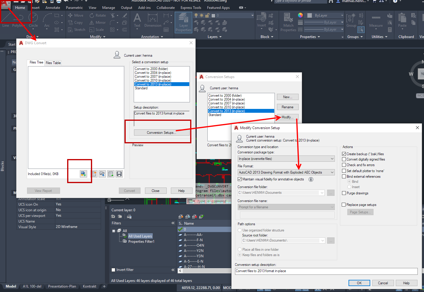 Det kan fungera att explodera AEC objekten, se bild nedan. Funktionen i Autocad heter DWG Convert (DWGCONVERT)