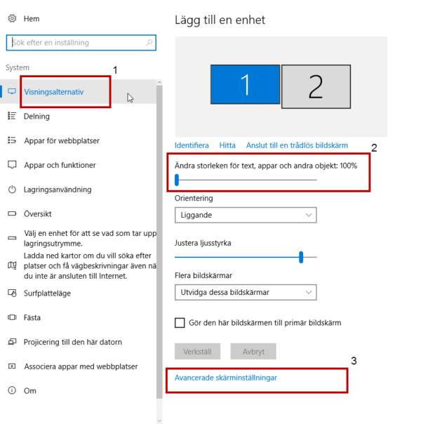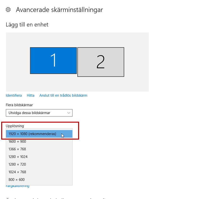 Markera dina skärmar i rutan ovanför och kontrollera att den ”(rekommenderade)” upplösningen används. Eventuellt måste man Logga ut från Windows för att denna inställning ska sparas och användas.