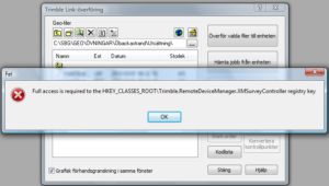 Detta kan bero på att man använder Geo med 64-bitars version. ”Trimble link” och ”Trimble DC” har ingen version av sitt program i 64-bitars version.