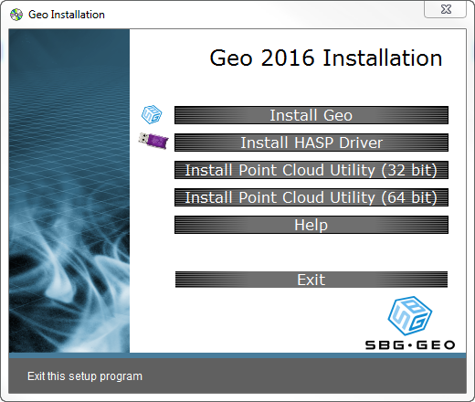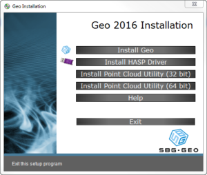Punktmolnsmodulen installeras inte automatiskt med Geo och det beror på att det finns två olika versioner. En för 32-bit och en för 64-bit Windows. För att installera punktmolnsmodulen, ladda ner en komplett installationsfil för Geo och välj den version som matchar ditt operativsystem. ”Install Point Cloud Utility (32/64 bit).